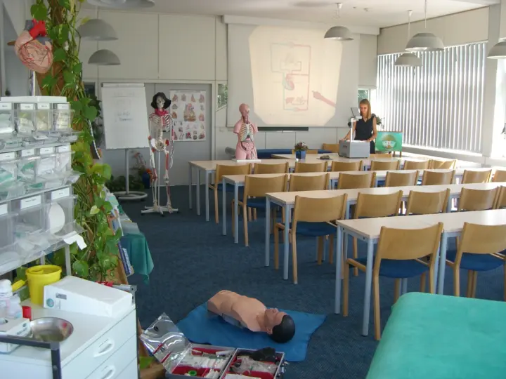 Selbstverständlich stehen unseren Teilnehmern ansprechende, helle Unterrichtsräume mit den modernsten anschaulichen (Lehrposter, Skelett u.a. Lehrmodelle) und technischen Lehrmitteln wie Flipchart, Overhead, Dia-Projektor, Beamer, CD/MP3-Player, Fernseher, Video/DVD zur Verfügung. Notfallkoffer, Reanimationspuppe, Injektionswagen, Materialien zur körperlichen Untersuchung sowie Utensilien zu Ausleit- und anderen Naturheilverfahren, Decken und Behandlungsliegen unterstützen die vielfältigen Praxis-Demonstrationen und Übungen während des Unterrichts.